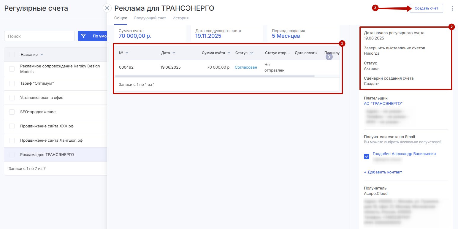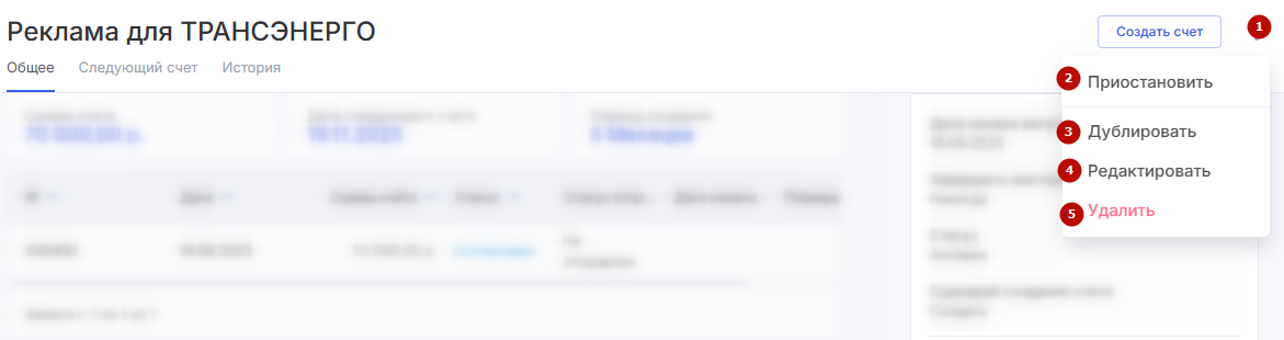 Созданный регулярный счет можно будет найти в списке регулярных счетов. В детальной странице регулярного счета вы можете: