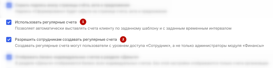 Чтобы использовать регулярные счета, в настройках модуля «Финансы» активируйте соответствующую опцию (1). Там же вы можете разрешить создавать регулярные счета пользователям с уровнем прав доступа «Сотрудник» (2) — по умолчанию их могут создавать только администраторы модуля.