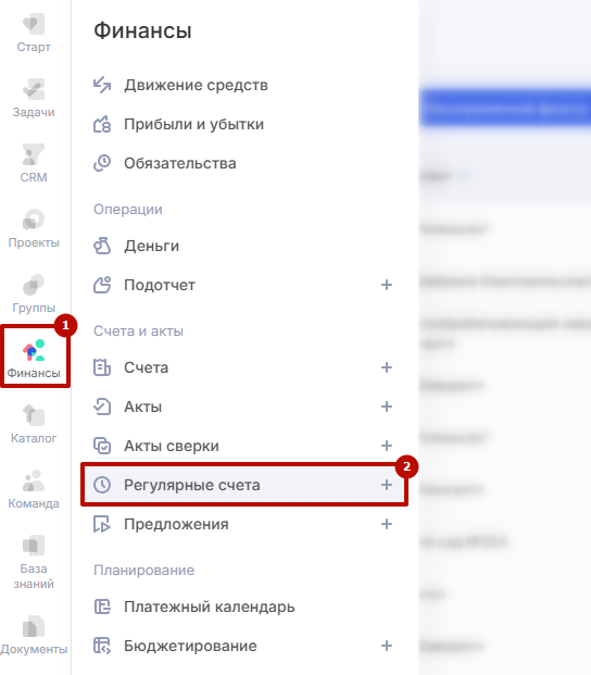 Перейти к регулярным счетам можно через боковое меню — откройте модуль «Финансы» (1) и перейдите в раздел «Регулярные счета» (2).