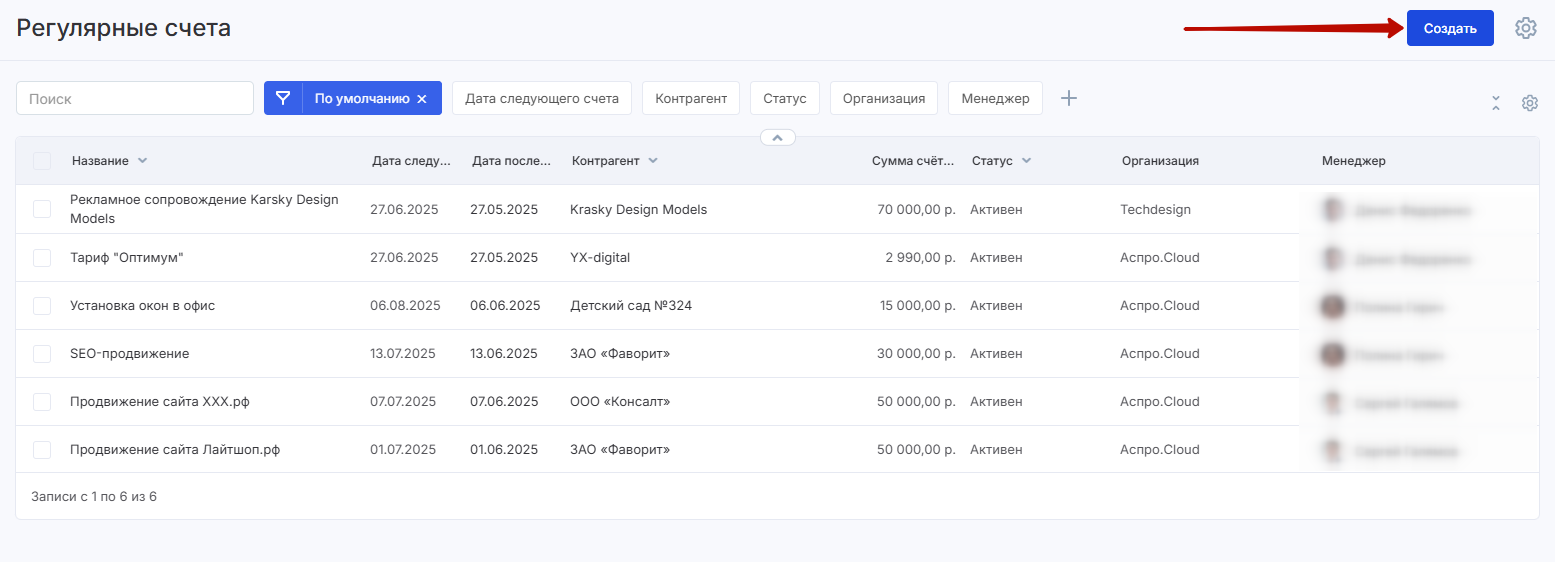 Чтобы приступить к созданию регулярного счета, нажмите кнопку «Создать».