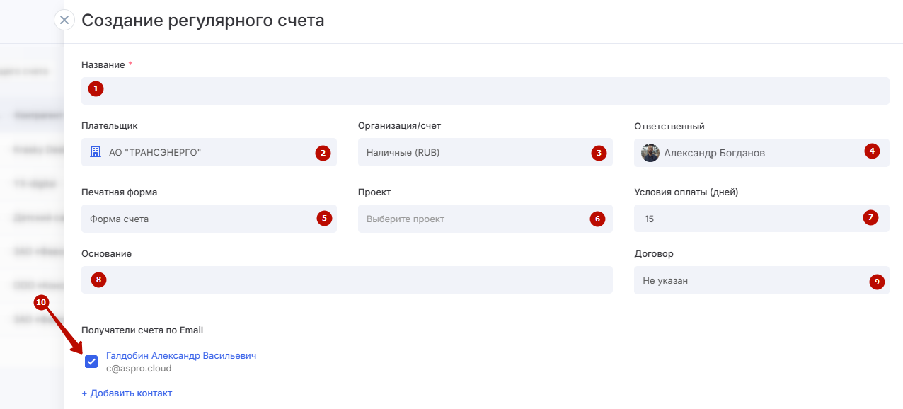 ответственный (4) — выберите сотрудника, который сможет редактировать регулярный счет (если он не является администратором модуля), а также будет получать уведомления об оплате;