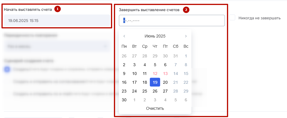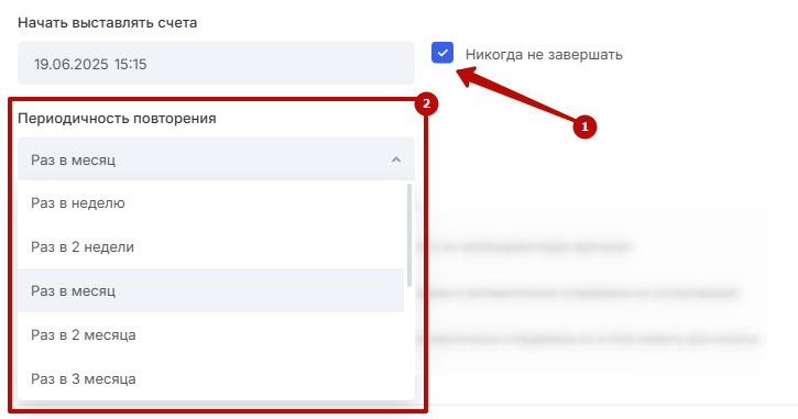 Если вы не планируете или не знаете дату завершения выставления счетов, поставьте галку в чекбоксе «Никогда не завершать» (1). В этом случае, чтобы прекратить выставление счетов, вам потребуется отредактировать шаблон.