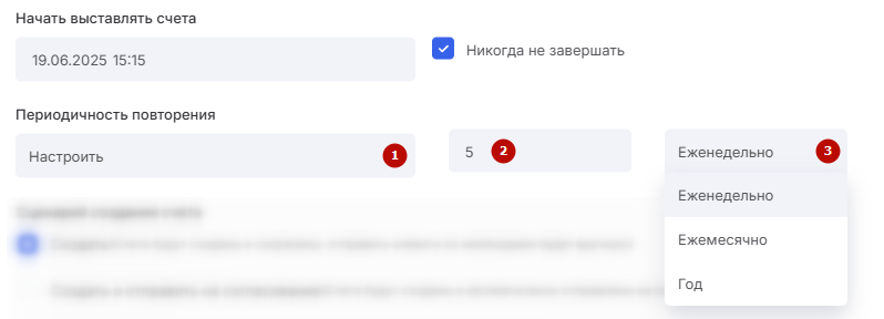 Затем выберите периодичность повторения (2) — интервал создания новых счетов — еженедельно, ежемесячно, ежеквартально ежегодно и так далее.