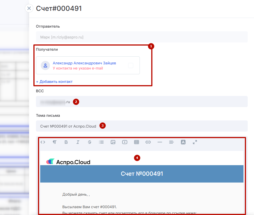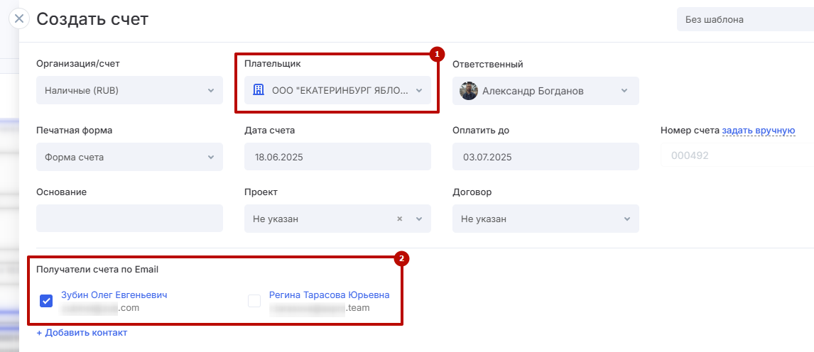 При создании счета нужно указать контрагента (1) — с ним в счет подтягиваются связанные с ним контакты (2). Отметками в чекбоксах можно выбрать те контакты, которым вы планируете отправить счет.