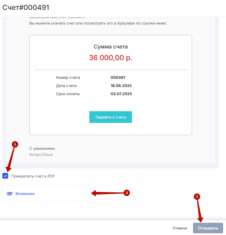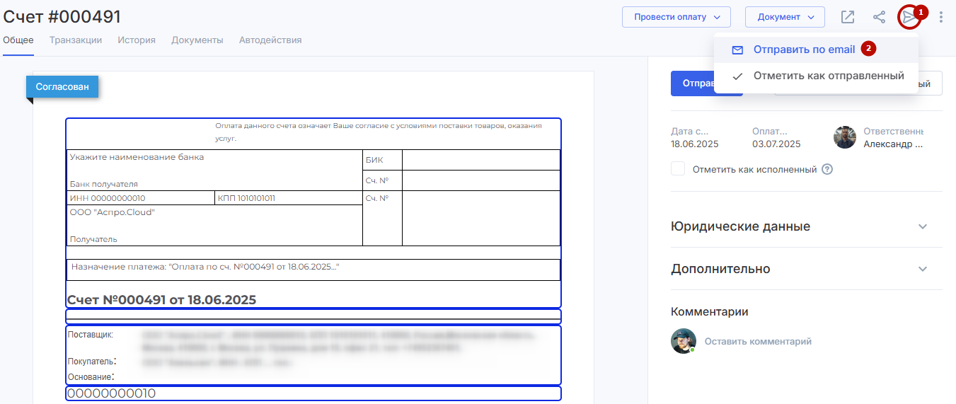 Чтобы отправить счет клиенту, в детальной странице счета нажмите на соответствующую иконку (1) и выберите пункт «Отправить по email» (2).