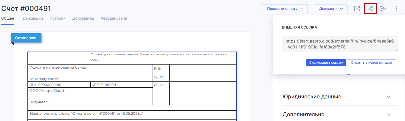 Скопировать прямую ссылку на счет можно по нажатию на кнопку «Поделиться» в счете.