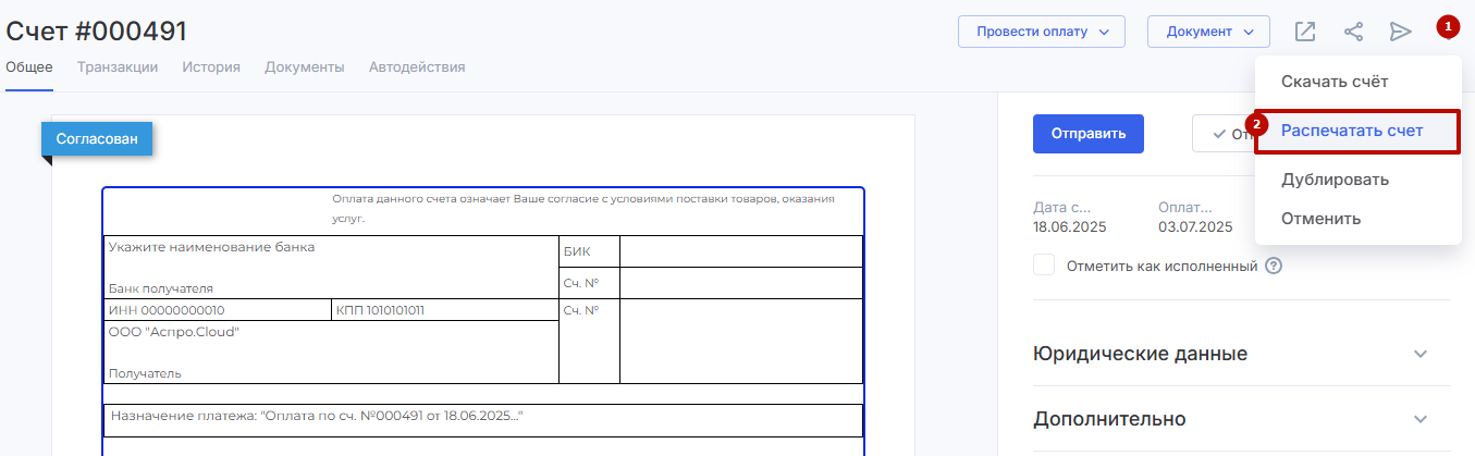 На детальной странице счета откройте контекстное меню в правом верхнем углу (1) и выберите пункт «Распечатать счет» (2).
