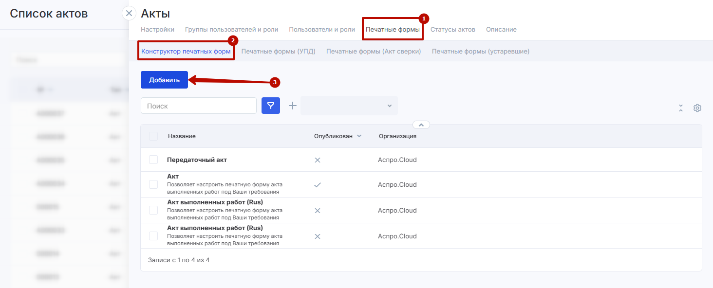 В настройках модуля «Акты» откройте вкладку «Печатные формы» (1) и перейдите во вкладку «Конструктор печатных форм» (2). Для создания новой формы нажмите кнопку «Добавить» (3).