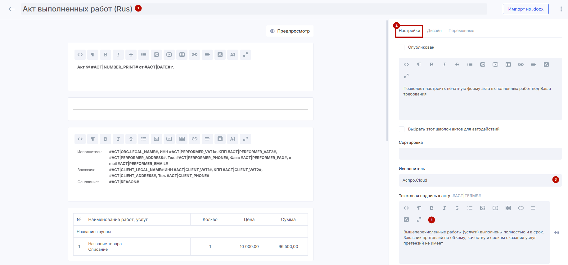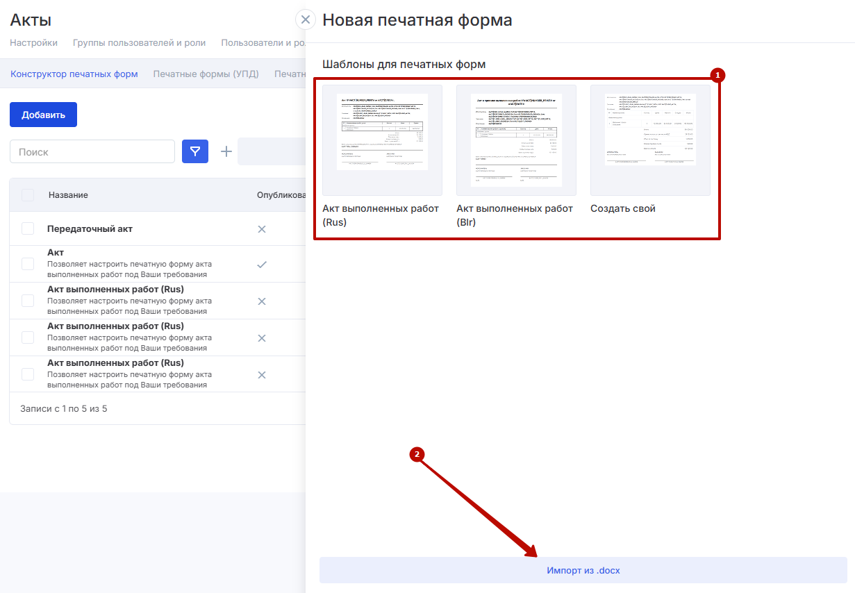 В открывшемся меню выберите шаблон печатной формы (1) для акта или загрузите свой в формате docx (2).