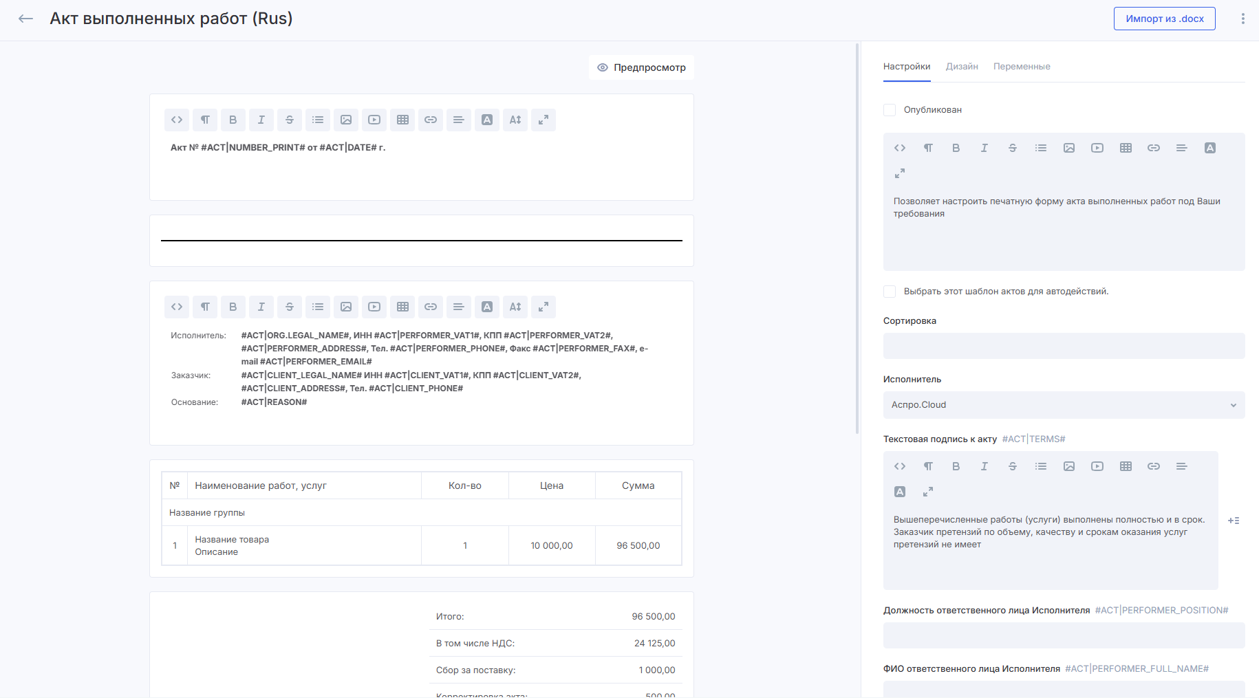 изменить дизайн акта — от шрифта и размера текста до таблиц и логотипа компании;