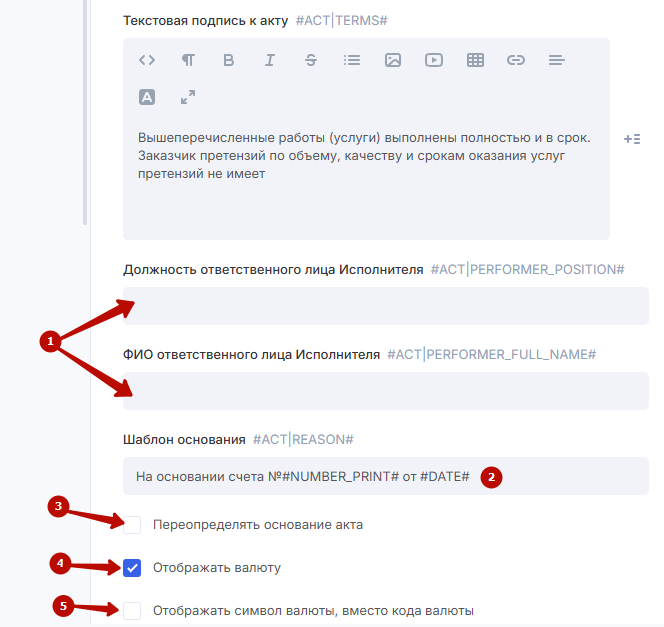 Отображать валюту (4) — если хотите, чтобы суммы в акте указывались с валютой;