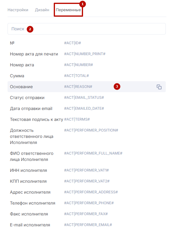 Во вкладке «Переменные» (1) содержится список всех переменных, которые могут вам потребоваться при создании акта. Список можно скроллить. Для поиска конкретных реквизитов воспользуйтесь поиском (2). Клик по любой переменной копирует ее код в буфер обмена (3).