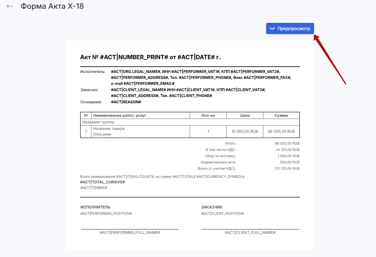 Как только вы закончите редактировать форму, вы можете посмотреть, как она будет выглядеть при создании акта — для этого активируйте предпросмотр.