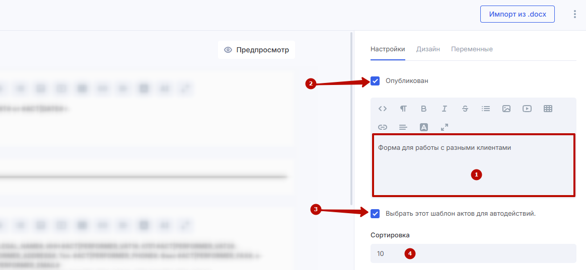 Чтобы использовать эту форму в актах, опубликуйте ее, поставив галку в соответствующем чекбоксе (2).