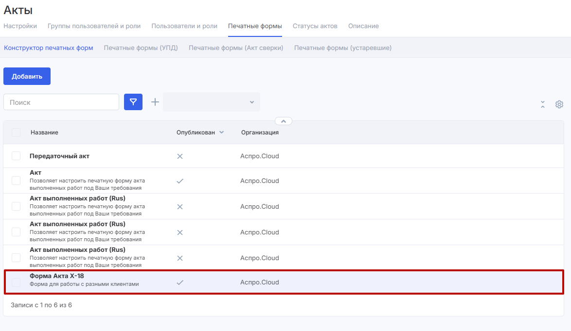 Прежде, чем создавать акты, вам нужно настроить их печатную форму. Настройка печатных форм происходит в настройках модуля «Акты».