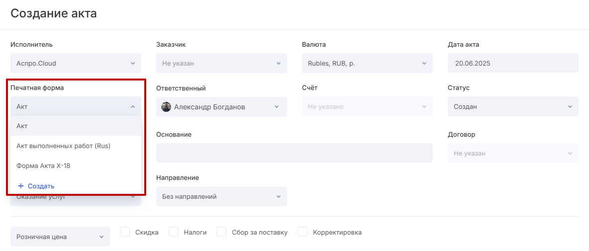 Чтобы применить созданную печатную форму, просто выберите ее при создании акта.