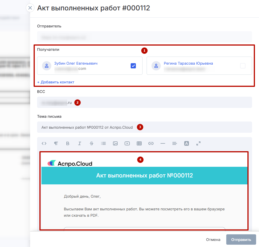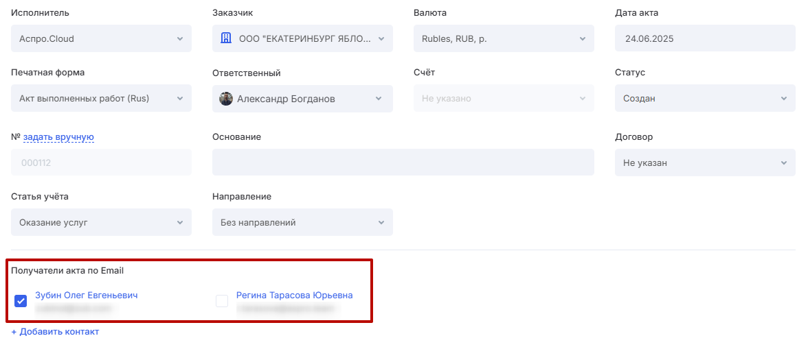 При создании акта вы указываете контрагента — с ним в документ подтягиваются связанные с ним контакты. Отметками в чекбоксах можно выбрать те контакты, которым вы планируете отправить документ.