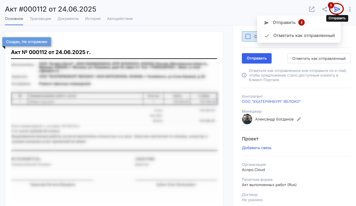 Для отправки акта по email откройте детальную страницу документа, нажмите на соответствующую иконку (1) и выберите пункт «Отправить» (2).