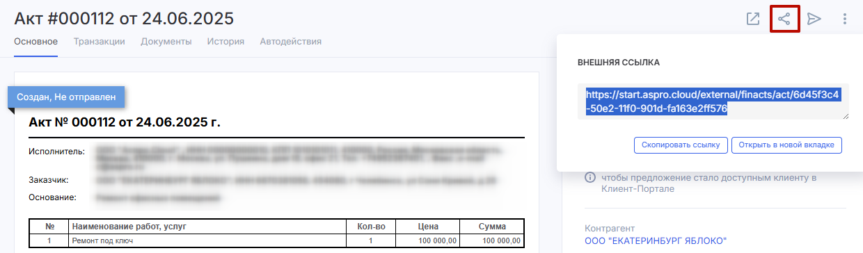Акт можно отправить прямой ссылок — например, через чат или мессенджер. Скопировать прямую ссылку на акт можно по нажатию на кнопку «Поделиться» в счете.