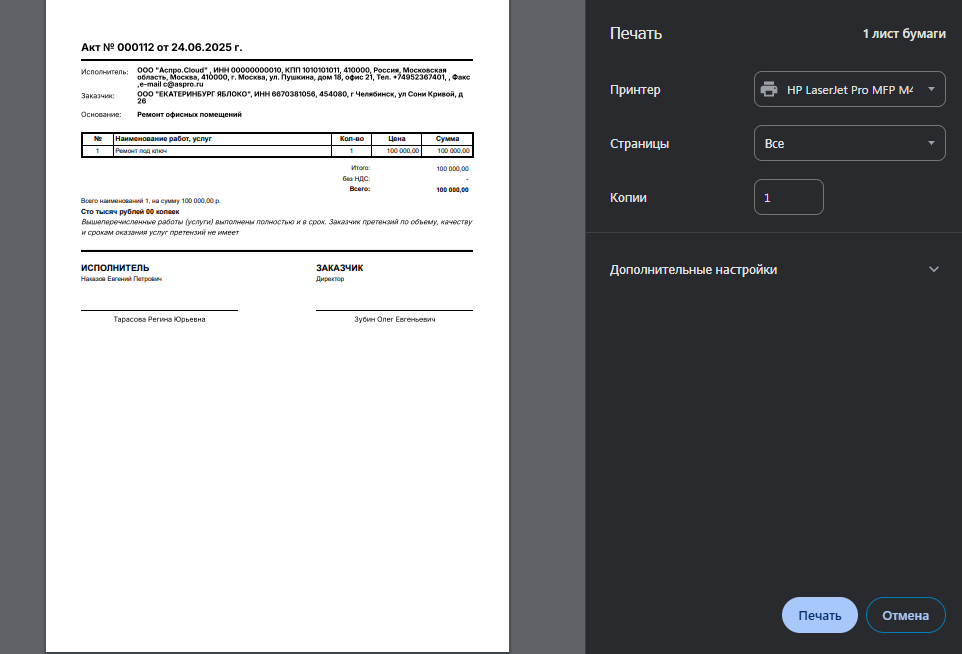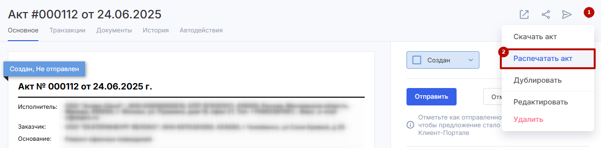 Если вы хотите лично передать акт заказчику и подписать его, документ можно просто распечатать. На детальной странице акта откройте контекстное меню в правом верхнем углу (1) и выберите пункт «Распечатать акт» (2).
