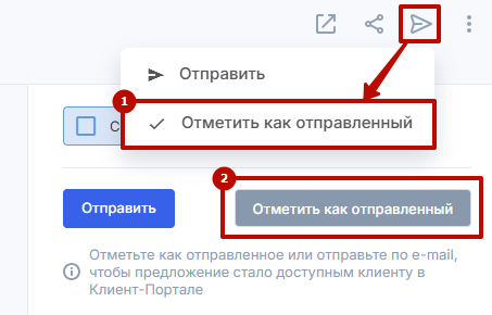 Через кнопку «Отправить» — выберите пункт «Отметить как отправленный» (1);