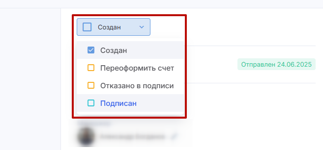 После того, как акт будет подписан заказчиком, измените его статус на «Подписан» — выберите статус в соответствующем поле.