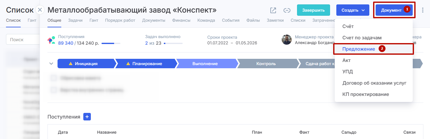 Чтобы создать предложение с привязкой к проекту, перейдите в нужный проект, нажмите на кнопку «Документ» (1) в шапке проекта и выберите нужный пункт меню — «Предложение» (2).