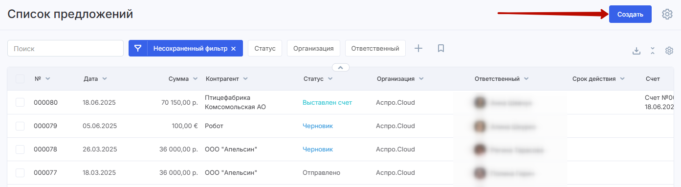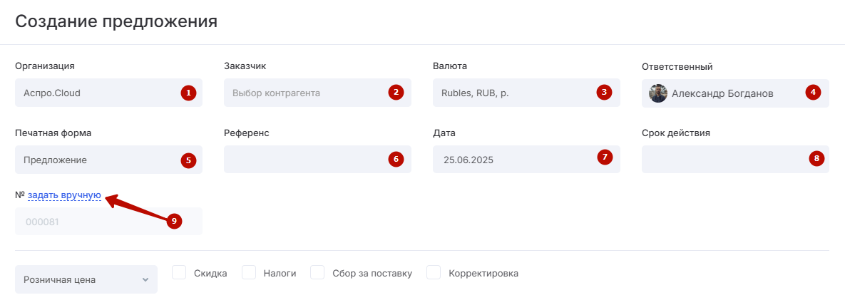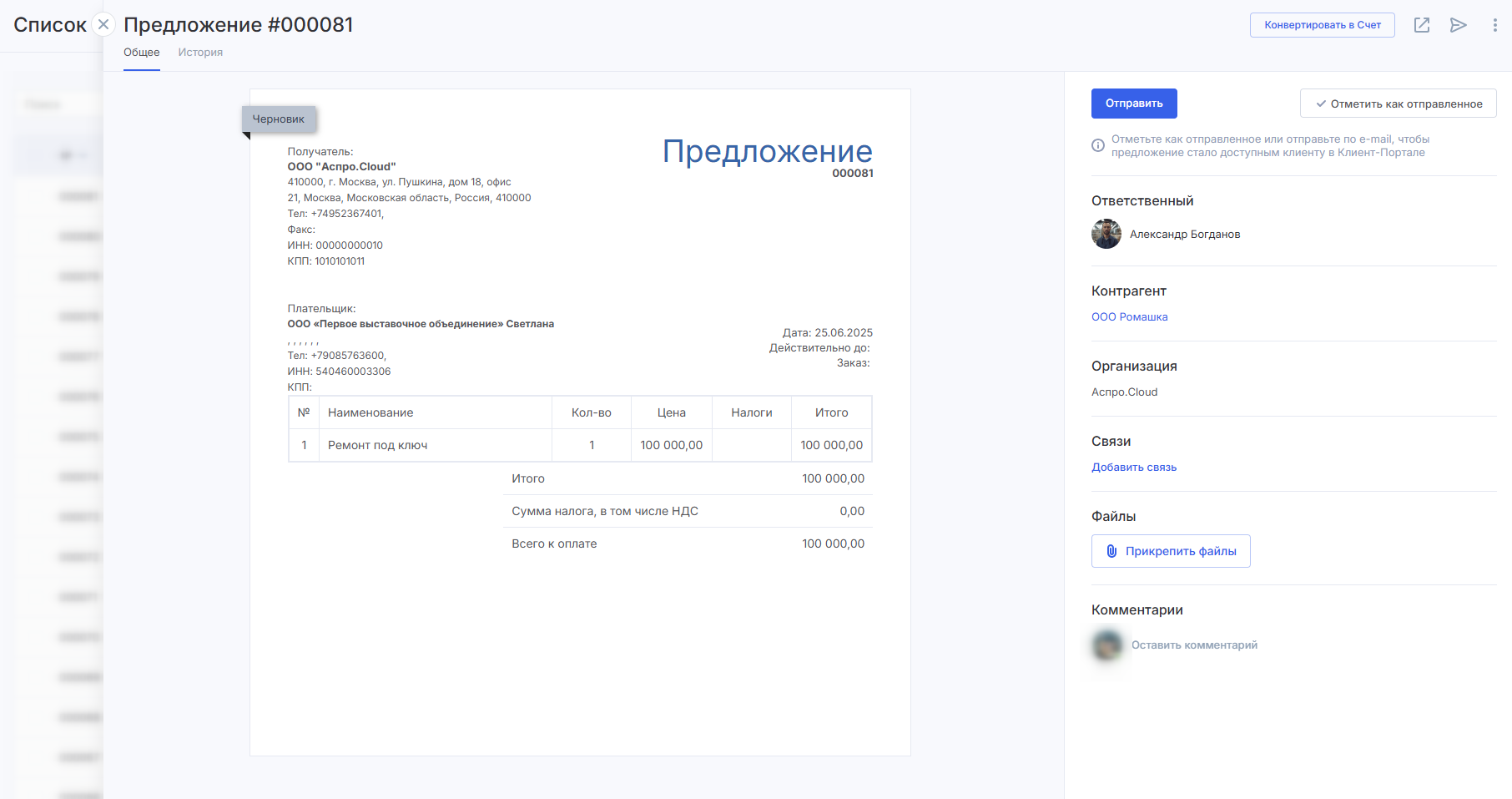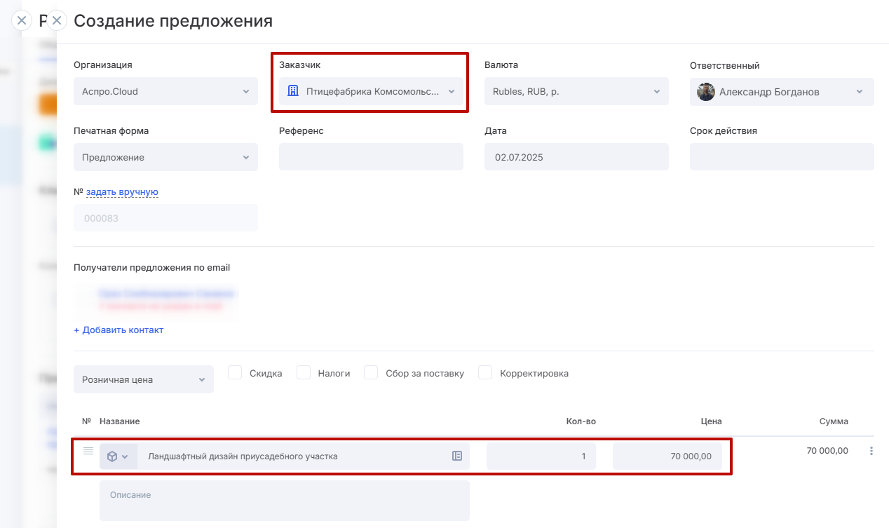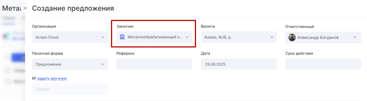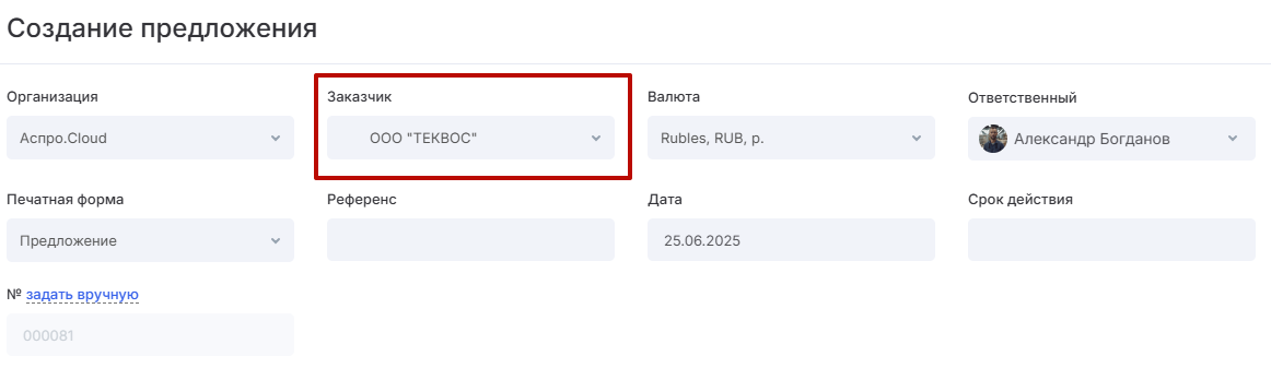 Откроется форма создания предложения, куда уже подтянется заказчик.