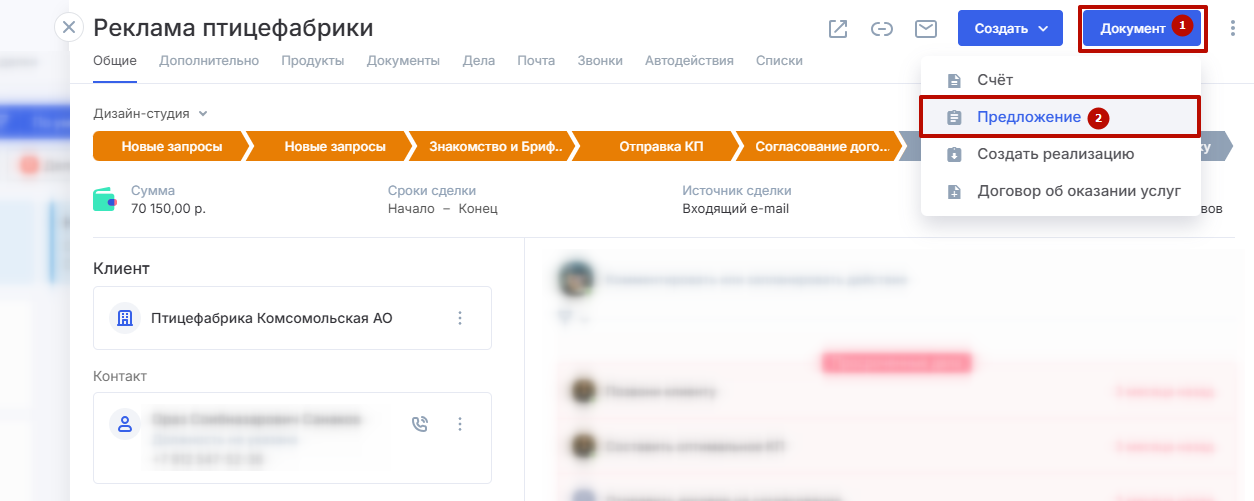Для этого в модуле «CRM» найдите интересующую вас сделку. Затем нажмите кнопку «Документ» (1) и в выпадающем списке выберите «Предложение» (2).