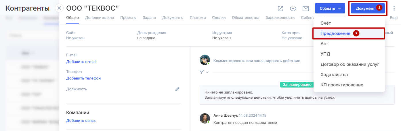 Откройте карточку нужного контрагента — например, из списка в модуле «CRM». Затем нажмите кнопку «Документ» (1) и в выпадающем списке выберите «Предложение» (2).