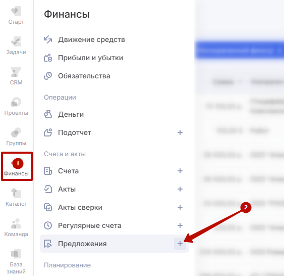 Откройте меню модуля «Финансы» (1) и нажмите на иконку в виде плюса рядом с «Предложениями» (2).