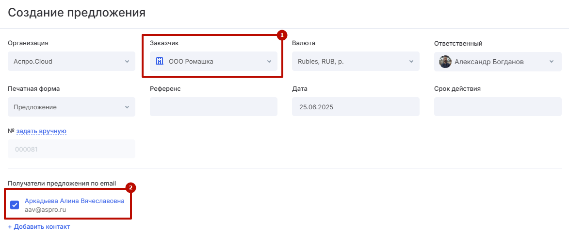 После указания заказчика (1) выберите контакт из числа прикрепленных (2) — тех, кому отправите предложение.