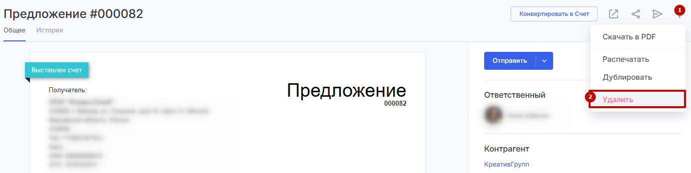 Коммерческое предложение можно удалить в любое время независимо от его статуса. Для этого откройте детальную страницу нужного вам предложения, откройте контекстное меню в правом верхнем углу (1) и выберите пункт «Удалить» (2).