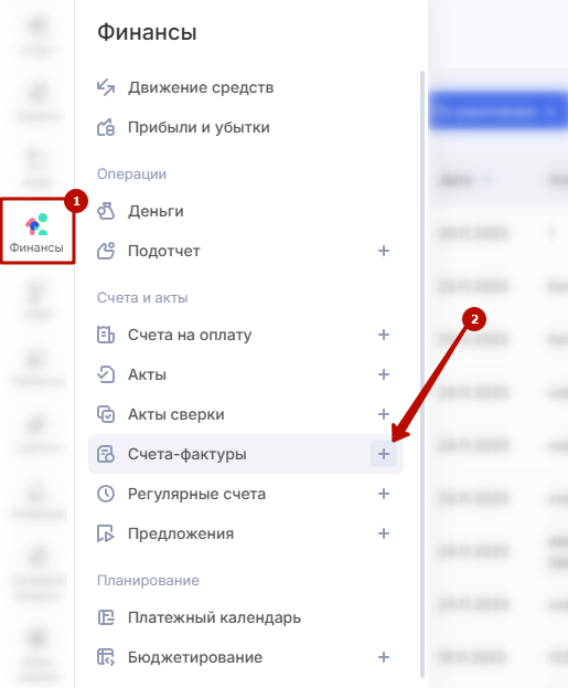 Чтобы создать счет-фактуру, откройте меню модуля финансы (1) и нажмите на кнопку создания (2) рядом с пунктом «Счета-фактуры».