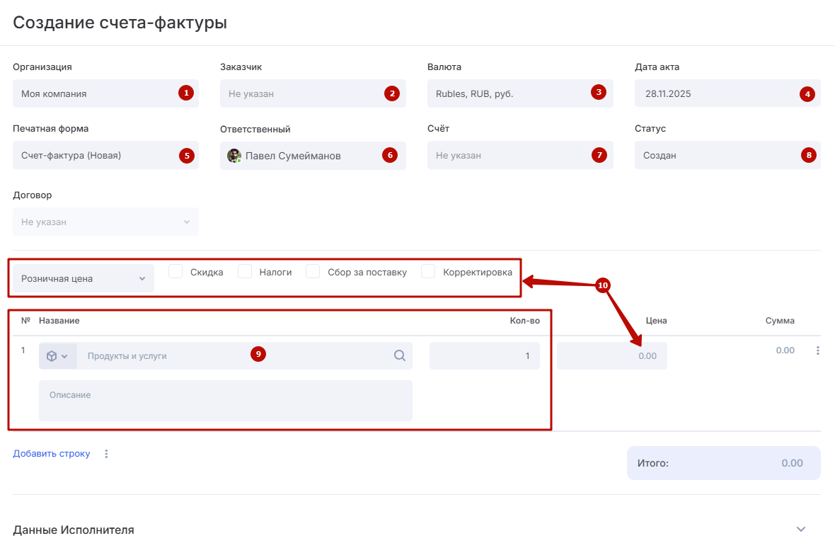 Поля с данными исполнителя будут заполнены в соответствии с печатной формой счета-фактуры (1).