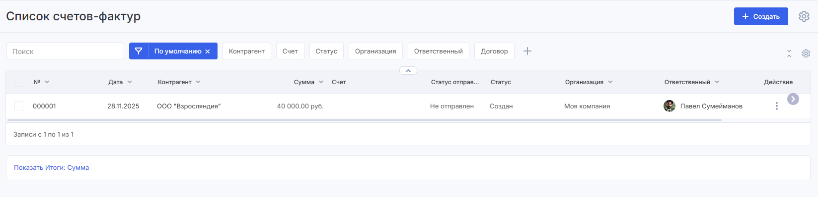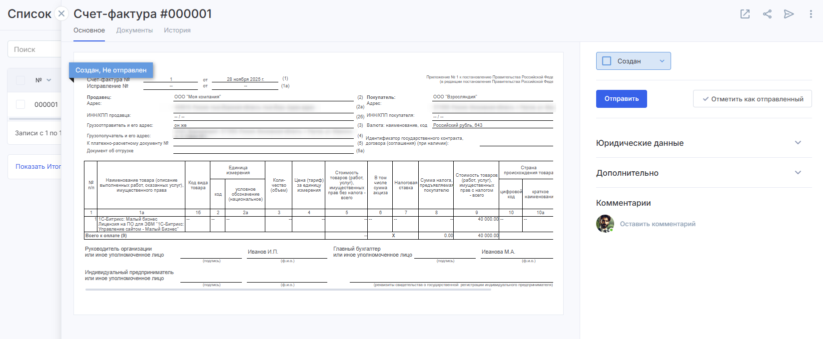 Затем сохраните счет-фактуру. Она отобразится в списке.