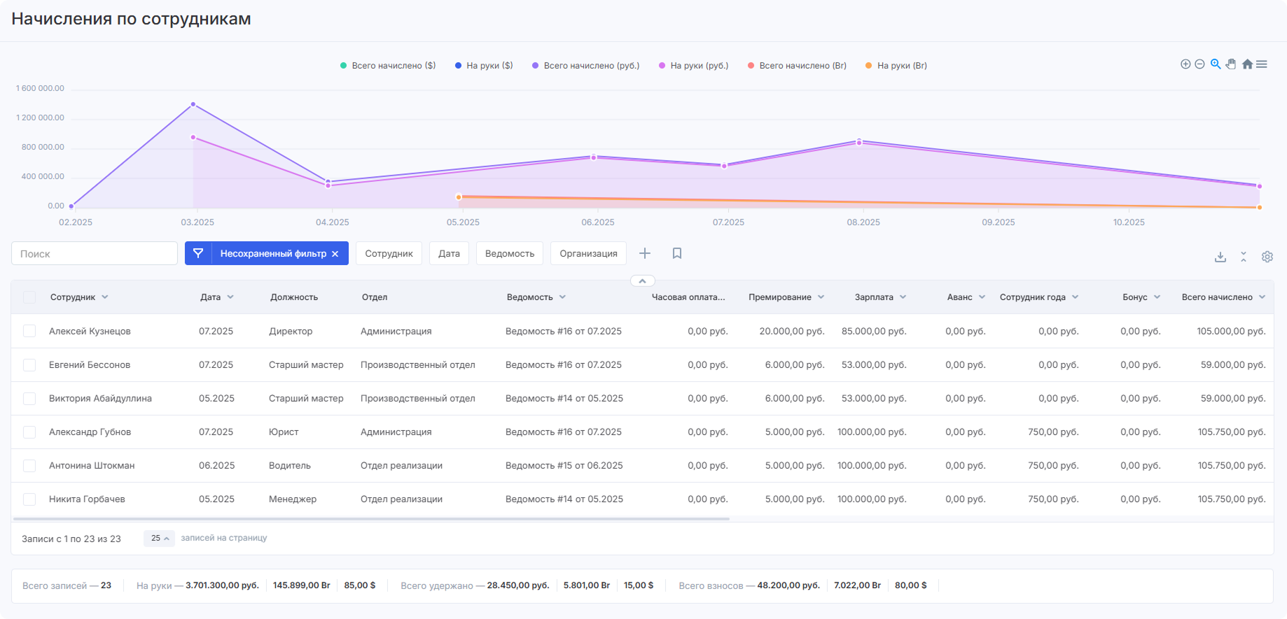 Основной раздел модуля — «Начисления по сотрудникам». В нем отображается график всех начислений по сотрудникам вашей компании, а также строится график с динамикой начислений и выплат.