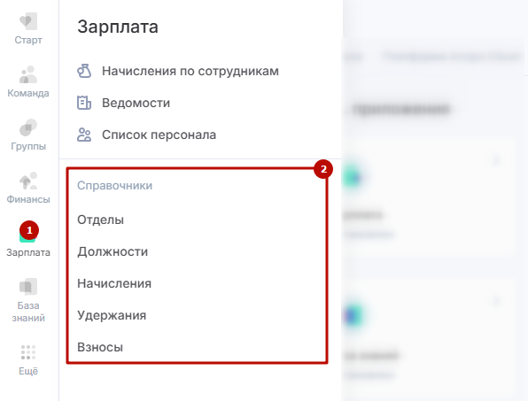 Доступ к справочникам можно получить прямо из меню модуля. Для этого просто откройте модуль в левом меню системы (1) — оттуда вы сразу сможете перейти к любому из доступных справочников (2).