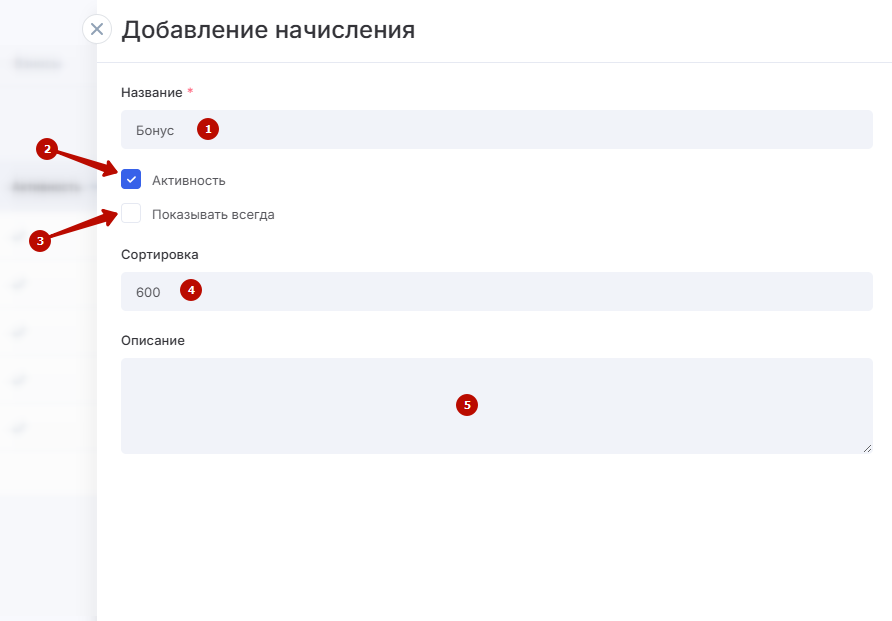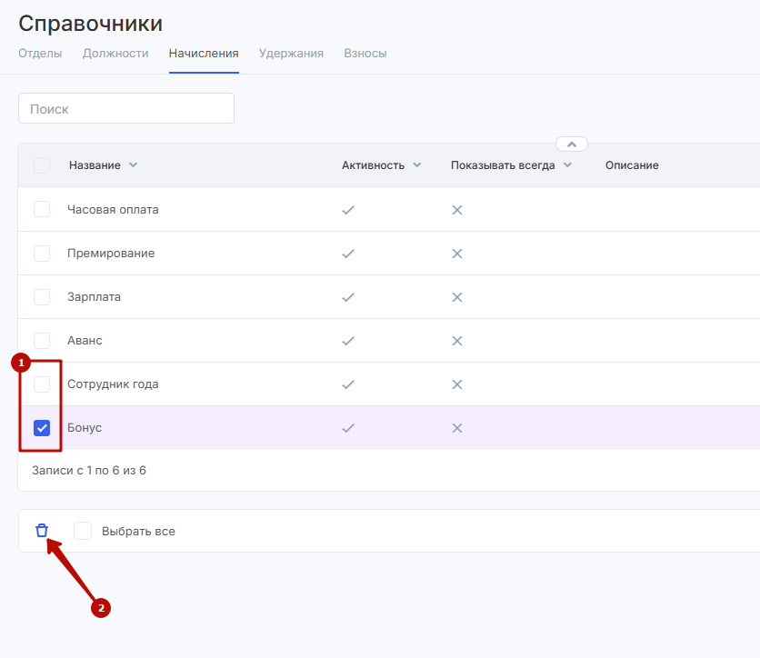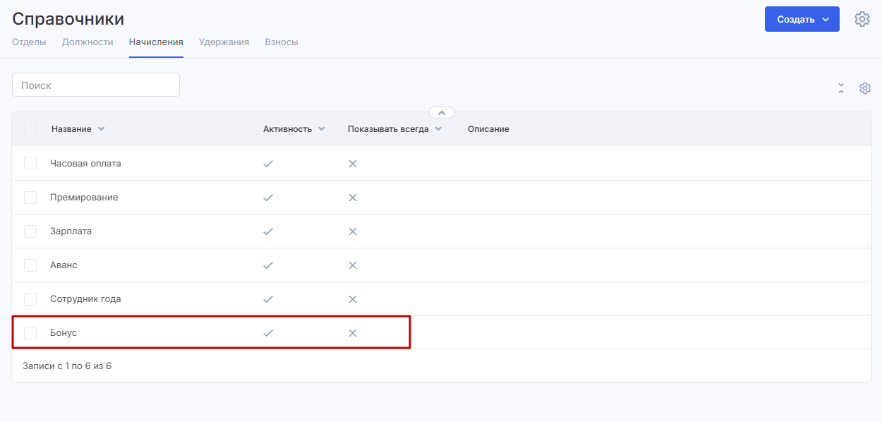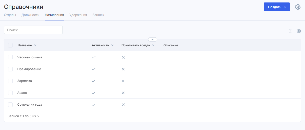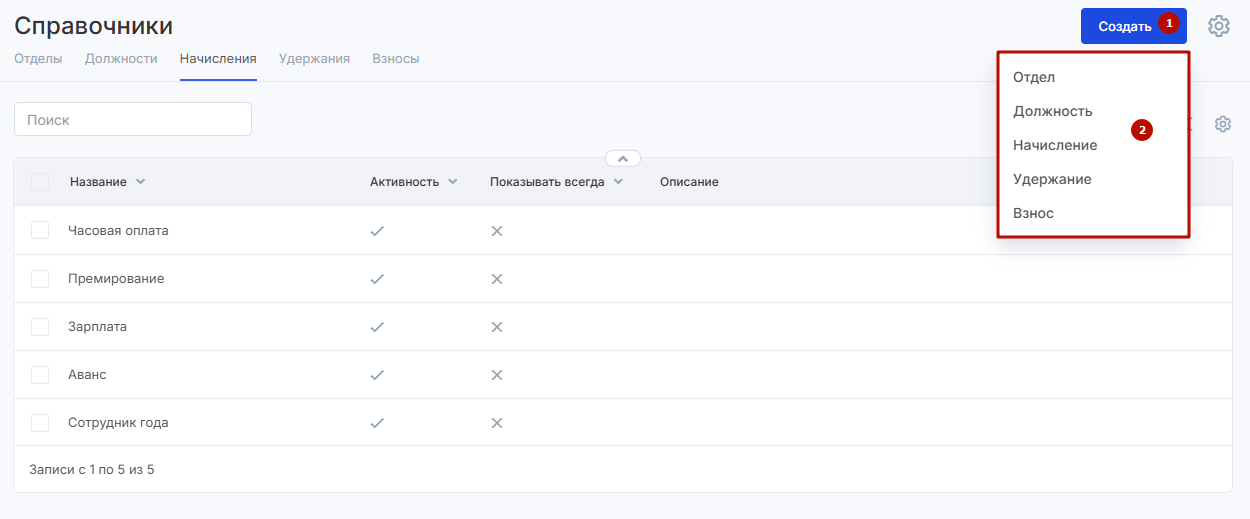 Начисления — типы денежных начислений, которые составляют зарплату ваших сотрудников (оклады, премии, дополнительные ставки);