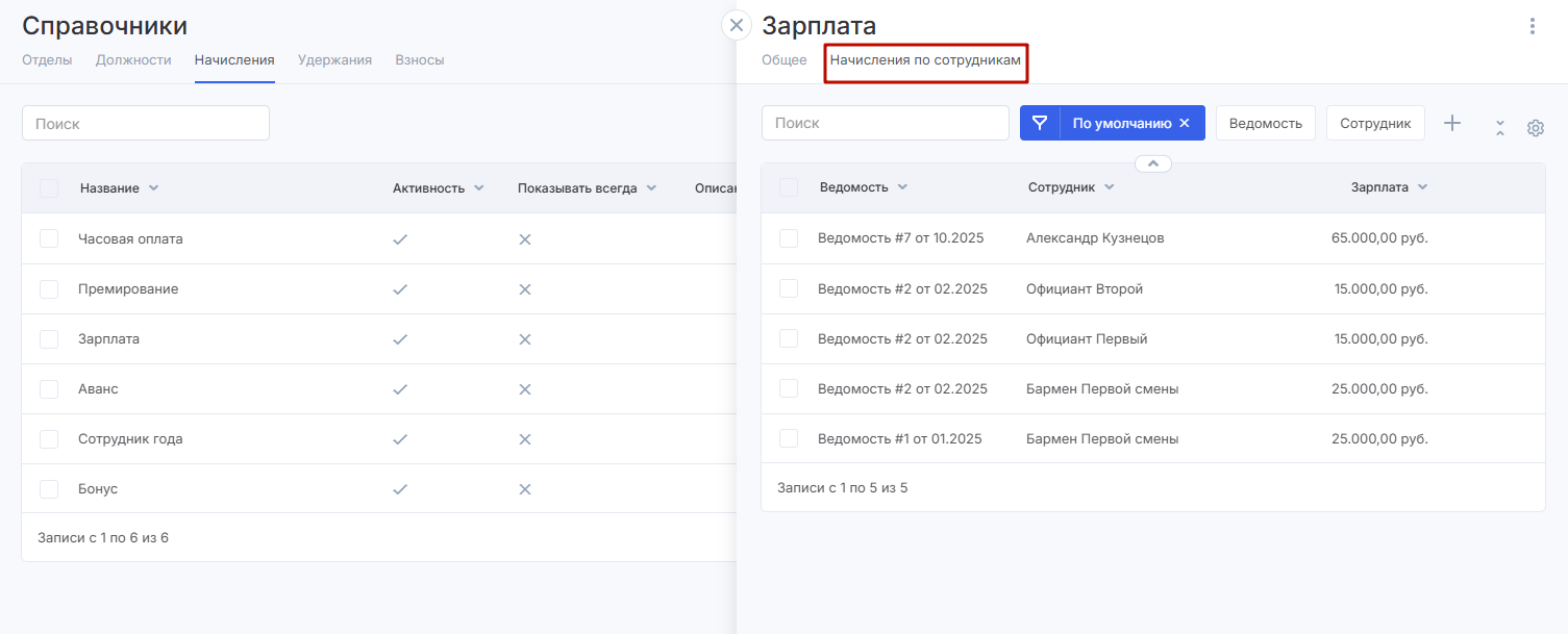 Ознакомиться со списком начислений можно в детальной странице категории, во вкладке «Начисления по сотрудникам».
