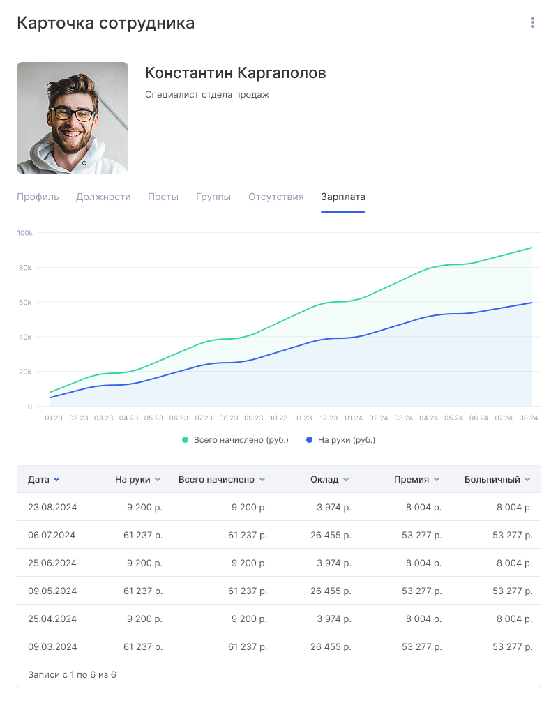 Сотруднику доступна только информация о начислениях на него — с детализацией суммы всех начислений и выданной на руки зарплаты.