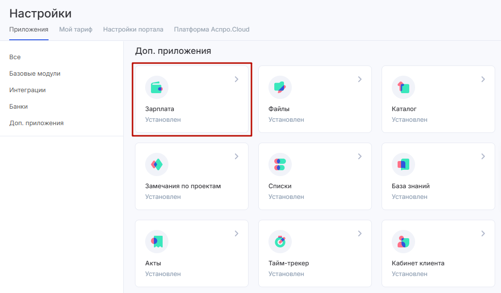 Изменять права доступа пользователей можно в настройках модуля. Просто найдите модуль «Зарплата» в списке приложений. Если модуль уже был установлен, при клике на его вы сразу попадете в настройки прав доступа.