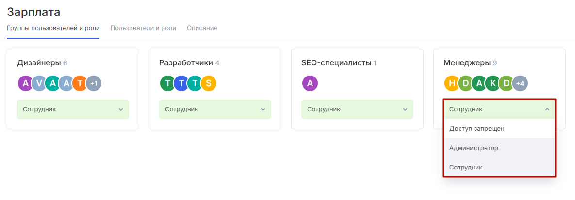 Если вы хотите изменить права сразу для целой группы пользователей, во вкладке «Группы пользователей и роли» выберите нужную группу и через выпадающий список установите ее уровень доступа. Он распространится на всех пользователей в группе.