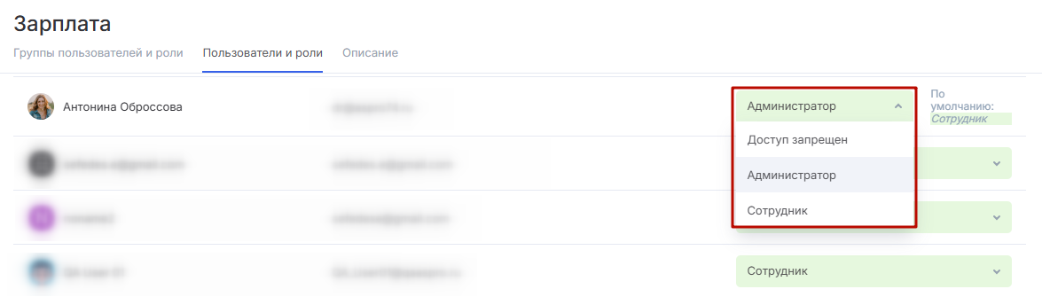Если же вы хотите назначить права доступа для конкретных пользователей — например, отобрать у кого-то права администратора, — перейдите во вкладку «Пользователи и роли», выберите конкретного коллегу и через аналогичный селектор установите уровень прав для него.