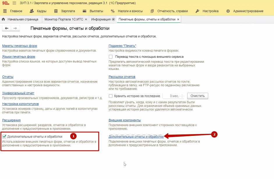 Сначала убедитесь, что у вас активен чекбокс «Дополнительные отчеты и обработки» (1);