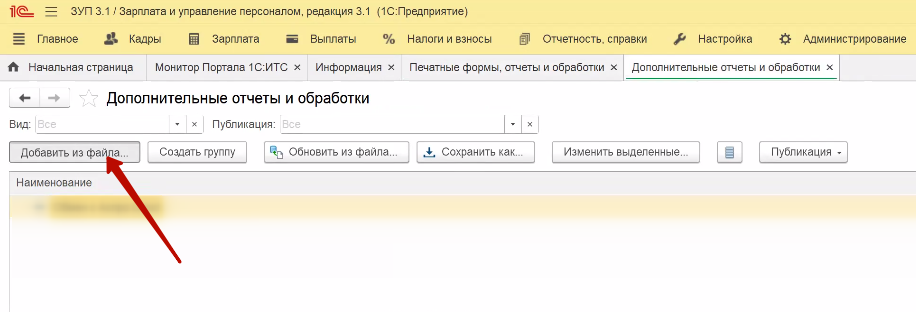 В подразделе «Дополнтиельные отчеты и обработки» нажмите кнопку «Добавить из файла», выберите файл с нашим модулем и загрузите его в 1С.