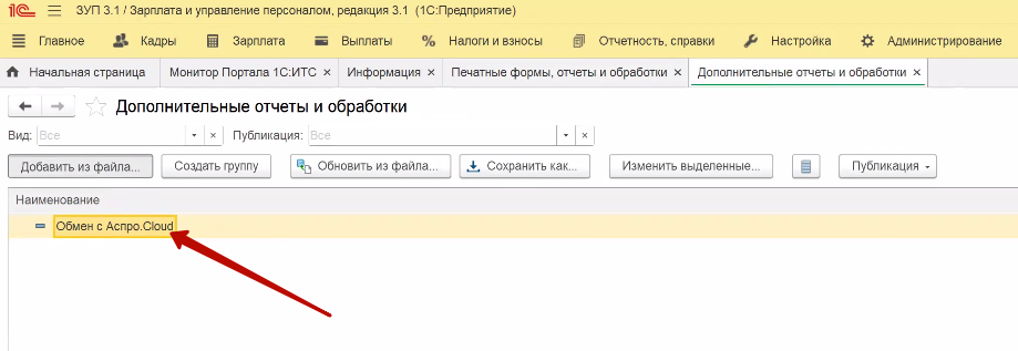 После загрузки в списке появится обработчик «Обмен с Аспро.Cloud»: