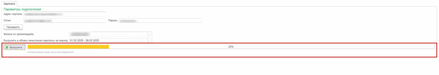 Модуль приступит к импорту — он будет синхронизировать списки сотрудников, а также виды начислений и удержаний. В зависимости от объема данных, синхронизация может занять до нескольких минут.