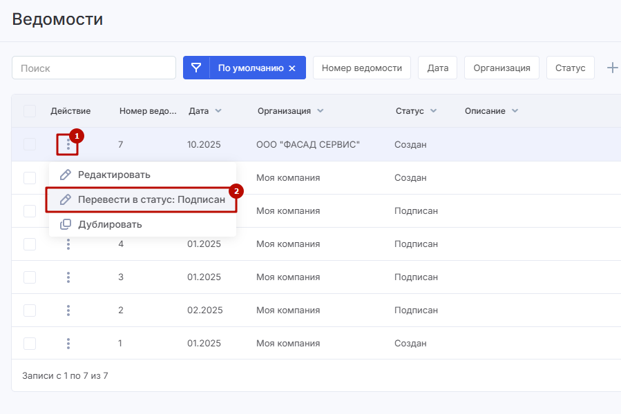 выберите нужную созданную ведомость в списке и откройте контекстное меню действий (1);