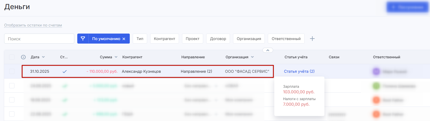 После перевода ведомости в статус «Подписан», в разделе «Деньги» в модуле «Финансы» автоматически будут запланированы расходы в статусе «ПиУ» — в соответствии с добавленными выписками.